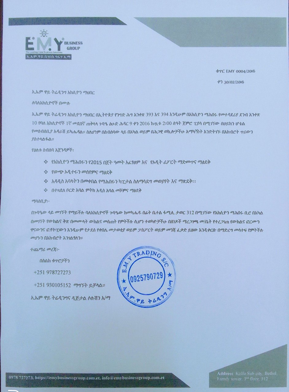 ኢ.ኤም.ዋይ ትሬዲንግ አክሲዮን ማህበር በኢትዮጵያ የንግድ ሕግ አንቀጽ 393 እና 394 እንዲሁም በአክሲዮን ማሕበሩ የመተዳደሪያ ደንብ አንቀጽ 10 የባለ አክሲዮኖች 1ኛ መደበኛ ጠቅላላ ጉባዔ ዕሁድ ሕዳር 19 ቀን 2016 ከጧቱ 2፡30 ሰዓት ጀምሮ ፒያሳ በሚገኘው በሀይከን ሆቴል የመሰብሰቢያ አዳራሽ ይካሄዳል።